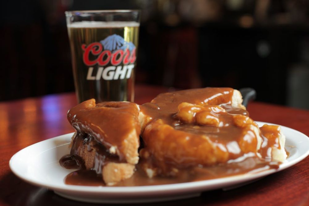 Freshly roasted turkey, meatloaf or roast beef and mashed potatoes piled on bread & smothered with gravy